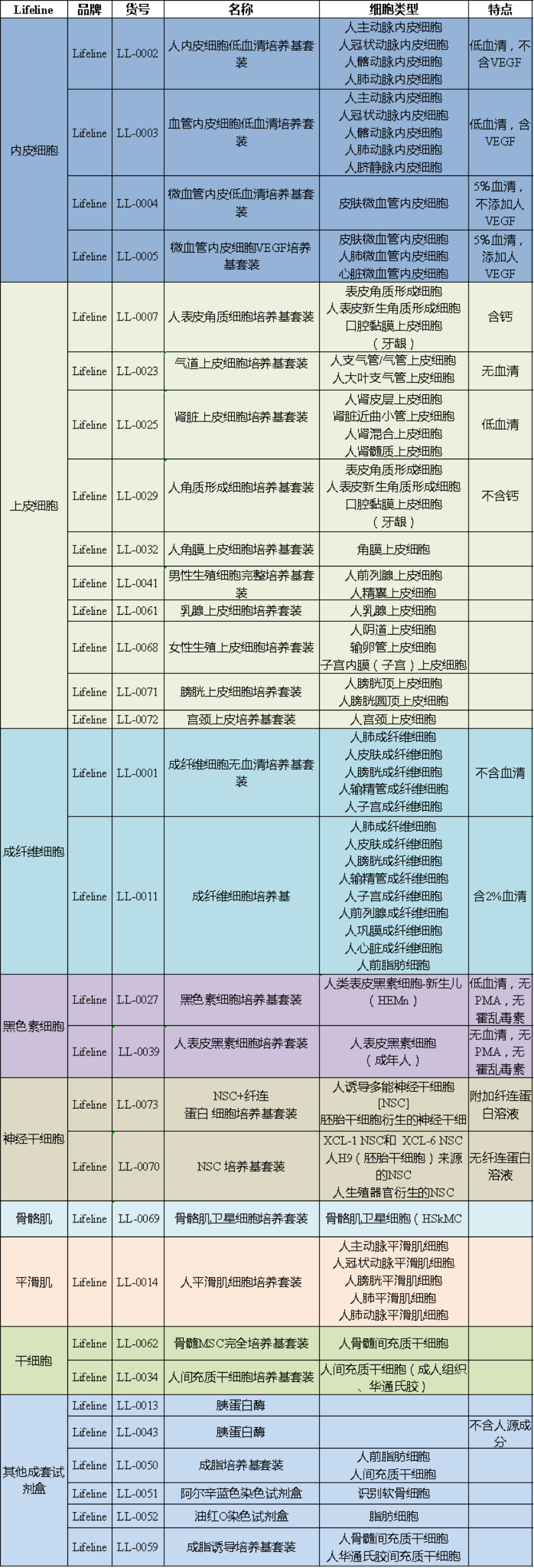 Lifeline常用培養(yǎng)基的信息,大家可以作為參考