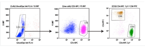 人外周血單核細(xì)胞 (PBMC) 可以使用免疫表型分析分為各種細(xì)胞類(lèi)型。在此實(shí)驗(yàn)中,使用靶向細(xì)胞表面的 CD3、CD4 和 CD8 蛋白的抗體檢測(cè) T 細(xì)胞并進(jìn)一步細(xì)分為 2 種主要亞群。CD3 是一種在所有 T 細(xì)胞中均表達(dá)的蛋白,它將 T 細(xì)胞與其他白細(xì)胞(中間、粉色細(xì)胞群)區(qū)分。一旦選擇了 T 細(xì)胞,CD4+ 和 CD8+ 細(xì)胞群就很容易區(qū)分。該實(shí)驗(yàn)還使用了一種死活細(xì)胞鑒定染料,以便從分析中排除死細(xì)胞 .