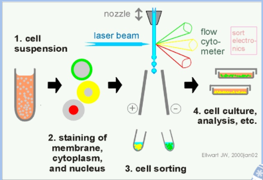 抗體可特異性靶向這些蛋白,有效添加一個(gè)彩色標(biāo)記,從而區(qū)分一種細(xì)胞類(lèi)型與另一種細(xì)胞類(lèi)型。該過(guò)程稱(chēng)為免疫表型分析,使研究人員能夠理解和監(jiān)測(cè)某種異質(zhì)細(xì)胞群中存在的細(xì)胞類(lèi)型的數(shù)量和百分比。免疫表型分析有益于表征免疫系統(tǒng)的各種組分,因?yàn)檫@些細(xì)胞存在于血液的懸浮液中,并且差異表面蛋白的特征極其明確。免疫表型分析通過(guò)抗體熒光標(biāo)記來(lái)實(shí)現(xiàn),這一過(guò)程稱(chēng)為偶聯(lián)。流式細(xì)胞術(shù)是精選用于免疫表型分析的方法,因?yàn)樗浅?欤棵肽芏繑?shù)千個(gè)細(xì)胞。