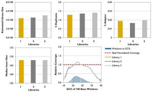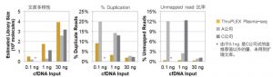 圖2. 高cfDNA文庫多樣性、更少的Unmapped Reads。ThruPLEX Plasma-seq Kit構(gòu)建的文庫,具有高的多樣性和低的duplicates和unmapped reads。圖中表示cfDNA分別提取于3份血漿樣品,文庫定量采用Qubit熒光定量。Bioanalyzer測定mononucleosomal DNA在各樣品的量分別為0.09 ng、0.62 ng、15.44 ng。Pooled libraries采用illumina NextSeq 500 paired end模式測序,且每個文庫產(chǎn)生17 M到25 M reads。每個文庫在down-sampling數(shù)據(jù)至17 M reads以后,計算Duplication rates。