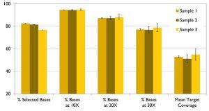 圖3. 優(yōu)異的靶向測序文庫構(gòu)建能力。圖中所示ThruPLEX Plasma-seq Kit構(gòu)建的文庫通過panel進(jìn)行高效捕獲,對kinome進(jìn)行深度測序分析以檢測突變。3個血漿樣品分別起始建庫量為5 ng、6.5 ng、10 ng,三次重復(fù)。目標(biāo)區(qū)域采用SureSelectXT2的ClearSeq Human DNA Kinome Panel進(jìn)行捕獲,并用Illumina Miseq平臺進(jìn)行測序,平均每個文庫獲得5 M reads,目標(biāo)堿基被成功捕獲分析。