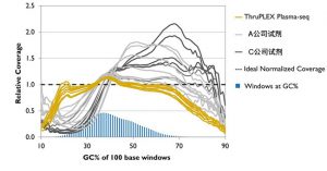 圖4. 高重復(fù)性的、無偏倚的GC覆蓋度。針對人類基因組,ThruPLEX Plasma-seq Kit表現(xiàn)出高再現(xiàn)性、低偏倚GC覆蓋度NGS文庫構(gòu)建能力。9次獨立的血漿樣品文庫構(gòu)建的實驗結(jié)果表明,ThruPLEX重復(fù)性高于其它產(chǎn)品。文庫的制備是利用的1 mL血漿來源cfDNA,后續(xù)采用illumina NextSeq 500進(jìn)行測序。作為對比,A公司試劑構(gòu)建了4份獨立血漿樣品的文庫。
