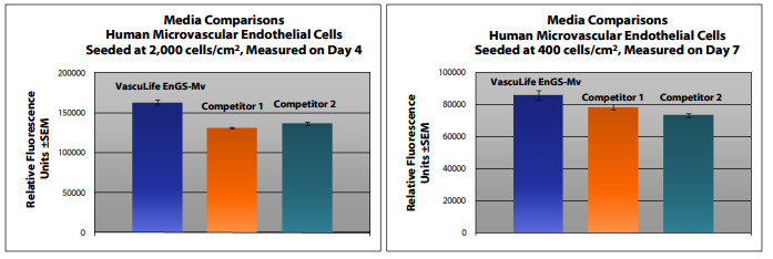 VascuLife?Engs-MV培養(yǎng)基在不添加人VEGF的情況下培養(yǎng)人微血管內(nèi)皮細(xì)胞,在保持良好細(xì)胞形態(tài)的同時(shí)達(dá)到或超過其他商業(yè)上用含血清培養(yǎng)基的速度。與其他商業(yè)媒體相比較,VascuLife? 在不同的播種密度下表現(xiàn)出更好的增殖能力。