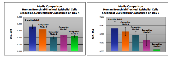BronchiaLife?培養(yǎng)基通過(guò)至少15次群體倍增生長(zhǎng)人類支氣管/氣管上皮細(xì)胞,小氣道上皮細(xì)胞和Lobar支氣管上皮細(xì)胞,達(dá)到或超過(guò)其他在售培養(yǎng)基,同時(shí)保持優(yōu)異的細(xì)胞形態(tài)。與其他在售培養(yǎng)基相比,BronchiaLife?在不同的接種密度下表現(xiàn)出優(yōu)異的增殖。