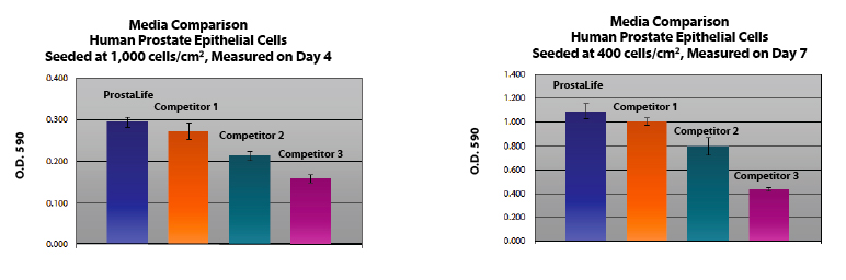 ProstaLife?培養(yǎng)基通過至少15倍的繁殖使人類前列腺上皮細胞和人類雄性生殖上皮細胞生長,其速度達到或超過其他市售培養(yǎng)基,同時保持出色的細胞形態(tài)。與其他市售培養(yǎng)基相比,ProstaLife?在不同播種密度下顯示出優(yōu)異的增殖能力。