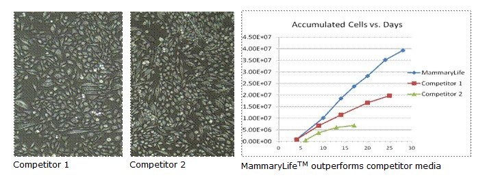 優(yōu)異的增殖能力:與其他市售培養(yǎng)基相比,MammaryLife TM可以 ?誘導(dǎo)人乳腺上皮細(xì)胞的優(yōu)異增殖能力和形態(tài)。