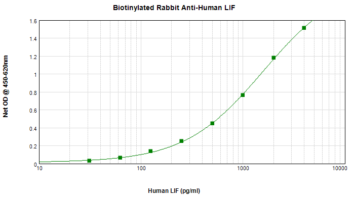 用雙抗體ELISA法(用100μl/孔)檢測(cè)人LIF,其濃度為0.25~1.0μg/ml。該生物素化多克隆抗體與PeproTech的多克隆抗人LIF(500-P39)作為包被抗體,可檢測(cè)出至少0.2~0.4ng/孔重組人LIF。