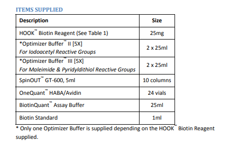 該試劑盒設(shè)計用于生物素與蛋白亞巰基的偶聯(lián),并提供25mg HOOK?-Biotin-PDA,用于增強偶聯(lián)的特定Optimizer Buffer?,Spin-OUT?色譜柱用于標記蛋白的純化,以及用于測定生物素化量的試劑。