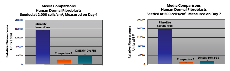2.原代成纖維細胞在FibroLife培養(yǎng)基中比在其他市售培養(yǎng)基中生長得更快